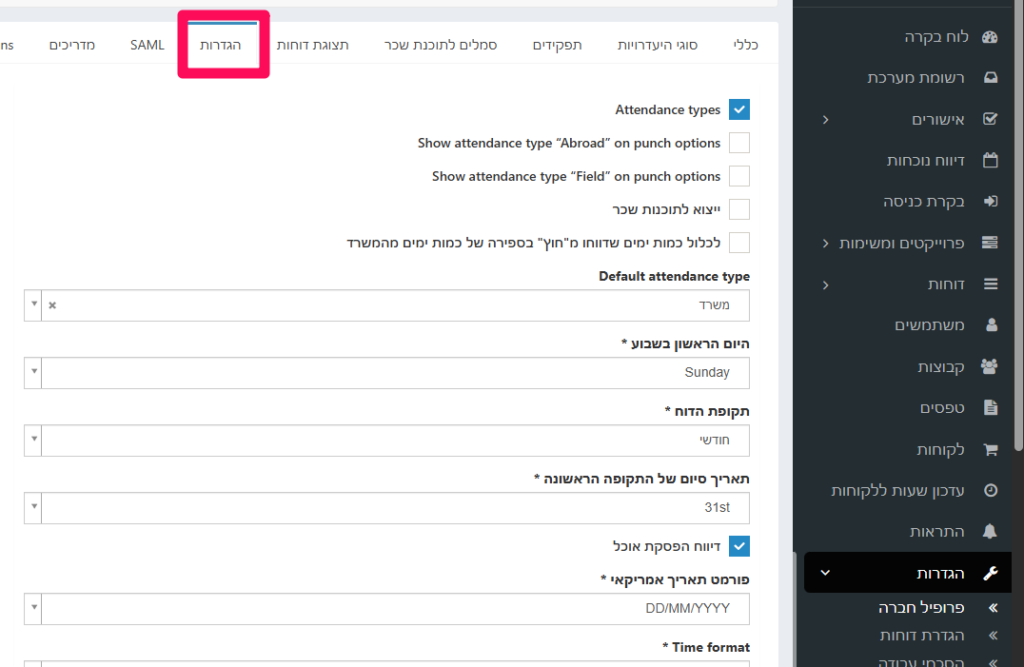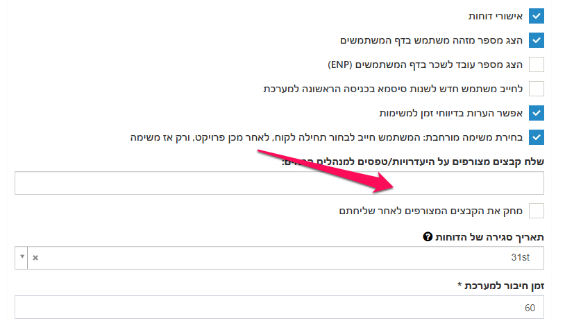נגלול למטה ונבחר בשדה Send time off attachements to users למי אנחנו רוצים שישלח הטפסים -> נלחץ על עדכן.