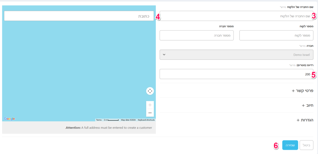 1. הגדרת מיקום: כנסו ל"לקוחות" -> "צור לקוח חדש"