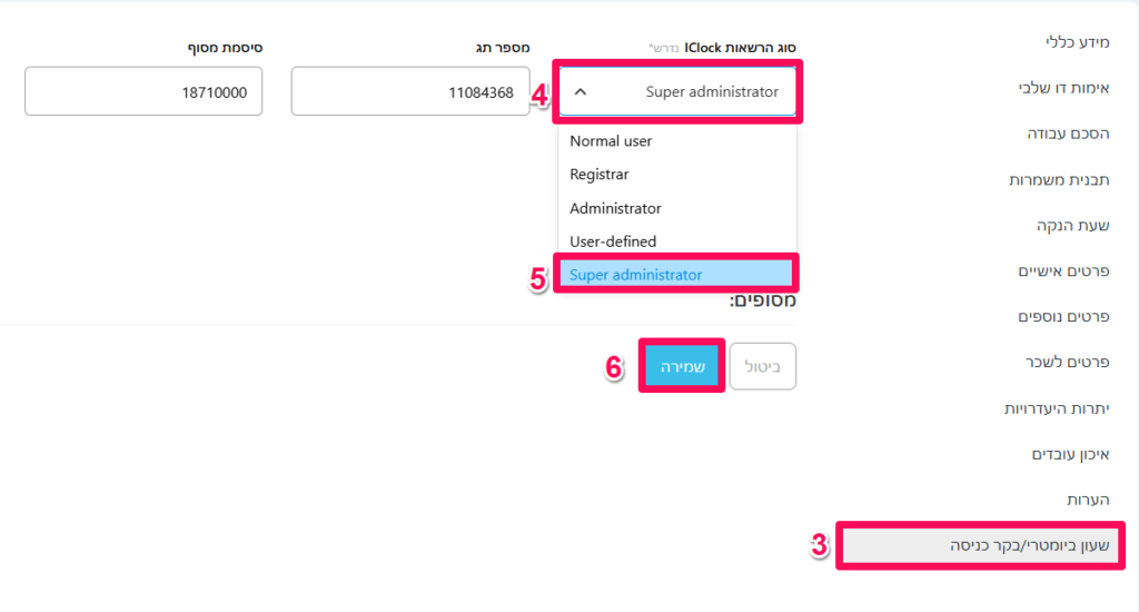 2. כנסו ל"משתמשים" -> בחרו במשתמש הרצוי -> תכנסו ל"שעון ביומטרי/בקר כניסה" -> בשדה "סוג הרשאות IClock" -> בחרו Super administrator -> לחצו על "שמירה".