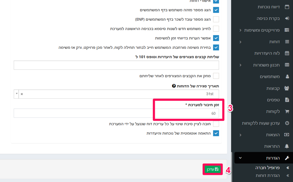 נגלול ונעדכן בשדה "זמן חיבור למערכתאת מספר הדקות שאנחנו רוצים שהמערכת תשאיר אותנו מחוברים,