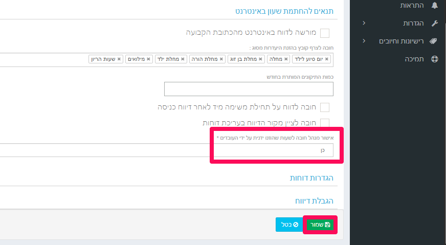 לאחר שנגדיר את הצורך באישור המנהל על השעות הידניות נוכל להיעזר במדריך בלחיצה כאן כיצד מאשרים את השעות על ידי המנהלים.