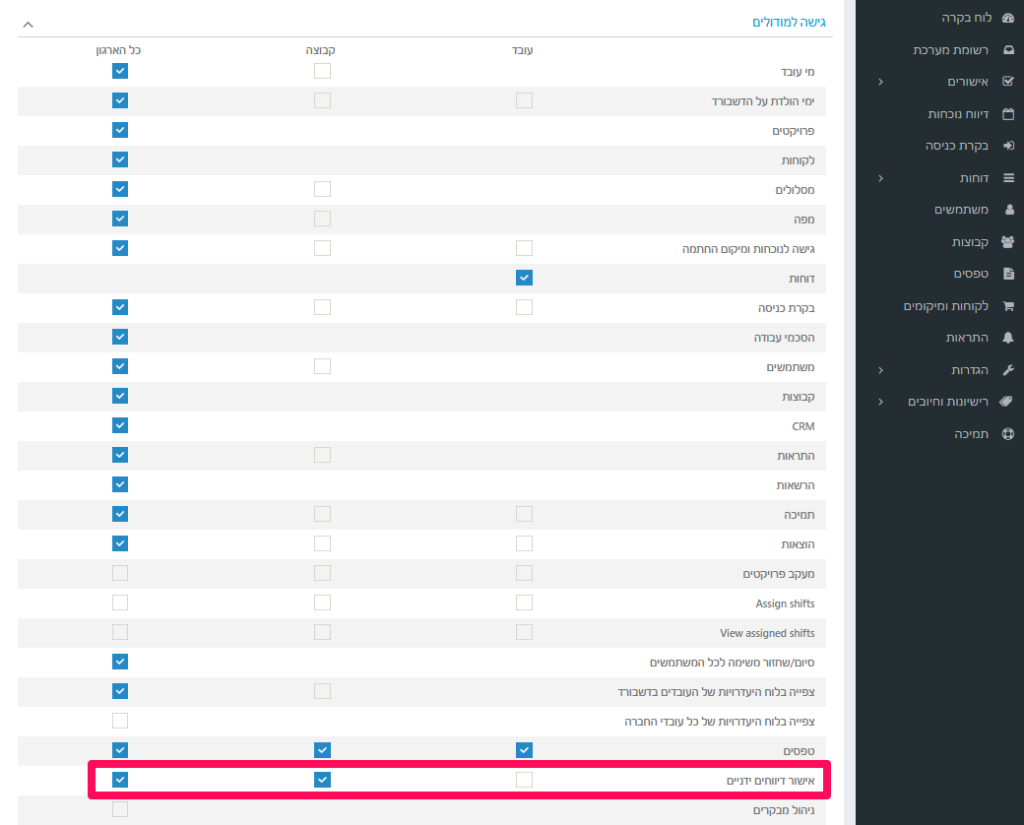 נפתח את לשונית "גישה למודולים" -> נבחר ב"אישור דיווחים ידניים" אם נכנסנו להרשאה של Administrator (מנהל מערכת) נבחר ב- V שבעמודה של "כל הארגון", אם נכנסנו להרשאה של Group Manager (מנהל קבוצה) נבחר ב- V שבעמודה של "קבוצה".
