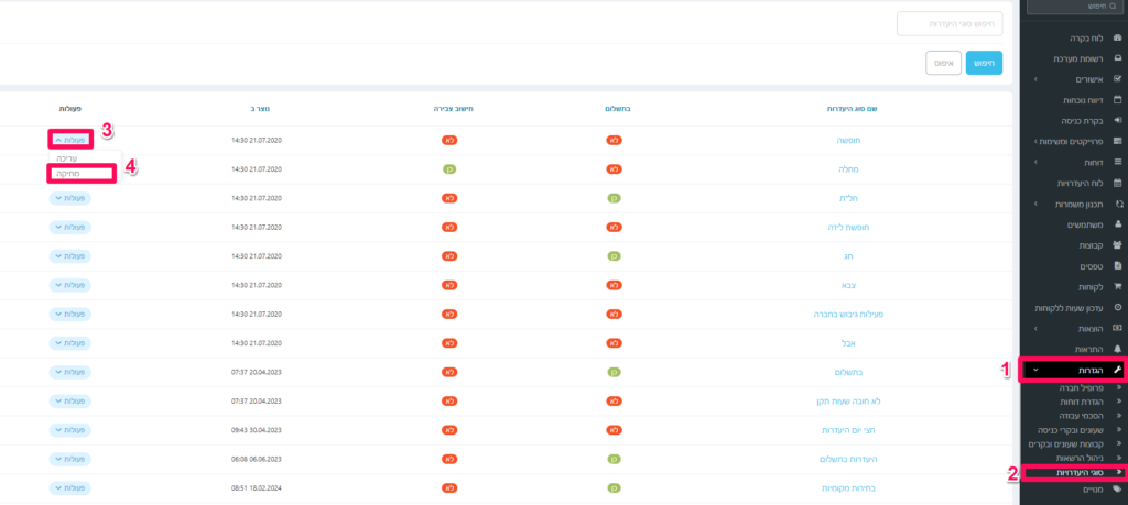 כדי להסיר סוג היעדרות לחצו על הגדרות -> סוגי היעדרויות -> פעולות (ליד הסוג היעדרות שאנחנו רוצים להסיר) -> מחיקה.