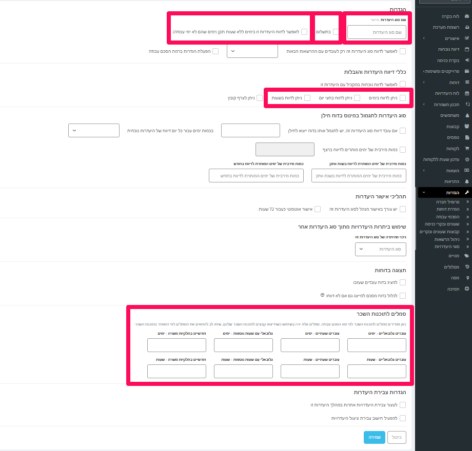 נקליד את השם, קבעו האם זה בתשלום או לא, האם אפשר לדווח בימים שהם לא ימי תקן, הגדירו כיצד ניתן לדווח על היעדרות זו: יום שלם, חצי יום, לפי שעות (ניתן לבחור מספר אופציות),