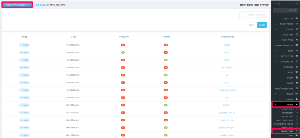 *הערה: אם אחד העובדים בחר מתישהו סוג היעדרות זה לא יהיה ניתן למחוק אותו, במקרה זה במידת הצורך ניתן להגדיר שרק הרשאה מסוימת תוכל לדווח את ההיעדרות, למדריך ניתן ללחוץ כאן.