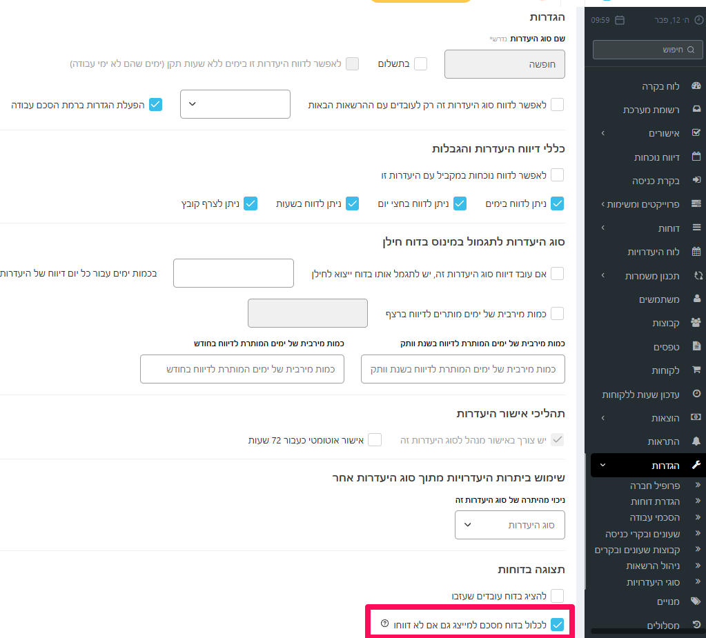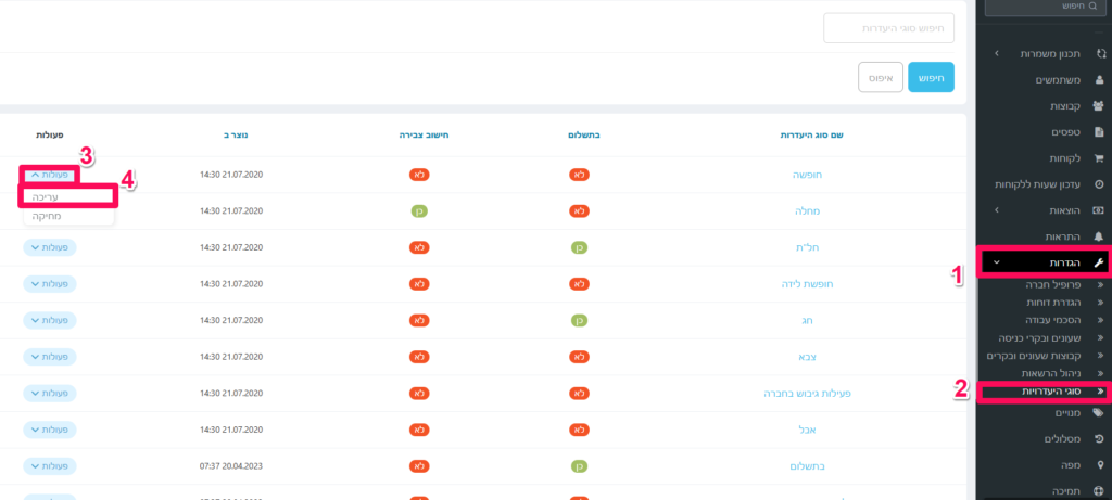 לוחצים על הגדרות -> לוחצים על "סוגי היעדרויות" -> נלחץ על פעולות בסוג היעדרות שאנחנו רוצים להגיד את האופציה הזאת -> נלחץ על עריכה.