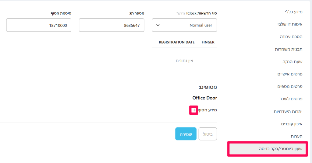 ניגש ל"שעון ביומטרי/בקר כניסה" -> נלחץ על ה"+" ליד השעון/בקר הרצוי.