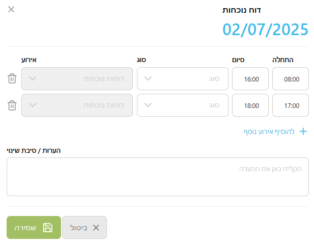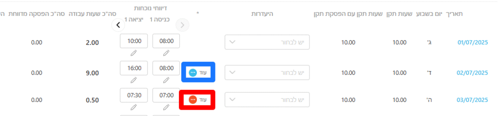 כדי לראות את כל דיווחי הנוכחות של אותו יום תוכל ללחוץ על התאריך עצמו (לדוגמה, "02/07/2025") או על כפתור "עוד".