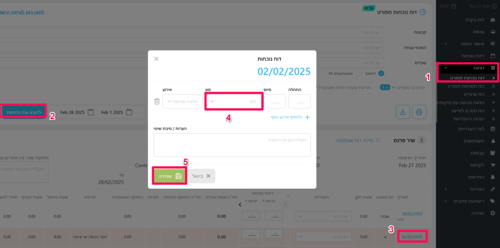 נלחץ על דוחות -> דוח נוכחות מפורט -> בוחרים את העובד שאנחנו רוצים לעדכן לו את מקור הדיווח, שעות או הערה -> לוחצים "להציג את הדוחות" -> בוחרים את התקופה שאנחנו רוצים (אם לא מופיעה התקופה אפשר לעבור ל"טווח תאריכים" ולבחור תאריכים ספציפים גם מעל לשנה) -> לוחצים על התאריך של אותו יום שאנחנו רוצים לעדכן -> מעדכנים את השעות, הערות ואת הסוג (מקור) דיווח -> שמירה.